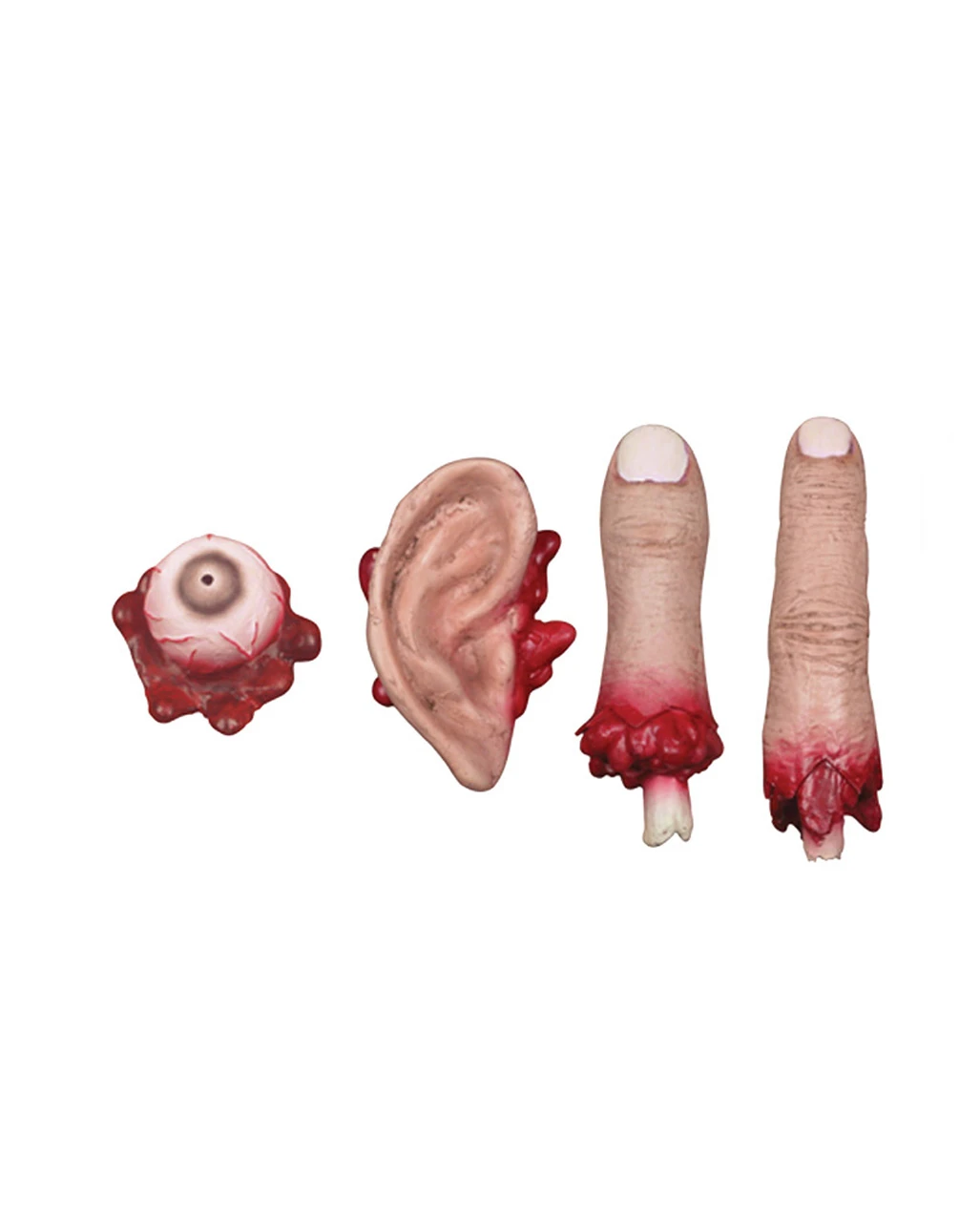 Die 4 x Spooky Halloween Körperteile sehen täuschend echt aus und sind damit eine geniale Splatter Deko. Das Set besteht aus dem abgetrennten Finger, Daumen, blutigem Auge und Ohr. Leg die Latex Leichenteile auf den Esstisch und sieh, wer einen starken Magen hat. Bitte achte aber darauf, dass niemand zugreift und sich die echt aussehenden Dinger in den Mund steckt. Schließlich sind die Augen, Finger und Ohren nur zum Ansehen als Gruseldeko geeignet.