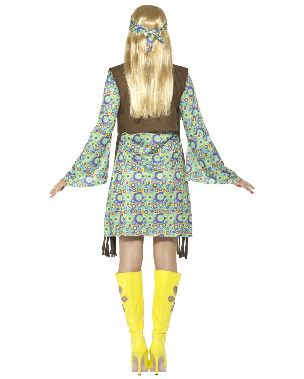 Das 60s Kostüm Hippie Chick besteht aus einem Kleid mit angenähter Weste, einer Halskette und einem Kopftuch. Das Kleid der Woodstock-Verkleidung verfügt über weite Trompetenärmel und ist übersät mit bunten Kreisen im Hippie-Stil. Eine angenähte Fransenweste mit Smiley- und Peace-Zeichen-Verzierungen unterstreicht den Flower-Power-Style. Ein lässiges Kopftuch im passenden Design sowie eine goldene Peace-Halskette komplettieren deinen Love-and-Peace-Look an Fasching! Dazu passen die Hippie Brille mit Ohrringen und die Kostümzubehör Hippie Tasche.