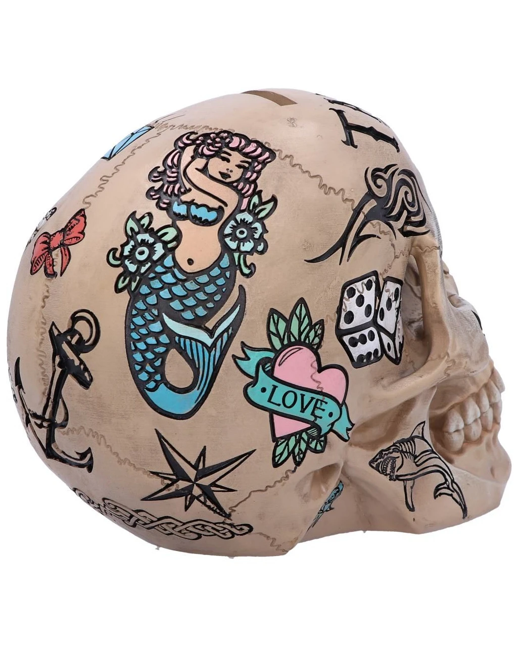 Unsere Calavera Tattoo Totenkopf Sparkasse zeigt einen knochenfarbigen Totenkopf der mit zahlreichen Tätowierungs-Stilen geschmückt ist. Darunter befinden sich sowohl traditionelle Tattoos als auch Stammes- und Illustrations-Tätowierungen. Die Motive sind in bunter Farbe gemalt, die im Kontrast zum naturfarbenen Totenschädel stehen. Nutze den Calavera Tattoo Totenkopf als Sparkasse bzw. Totenkopf Münzdose oder als dekorativen Blickfang im Regal!