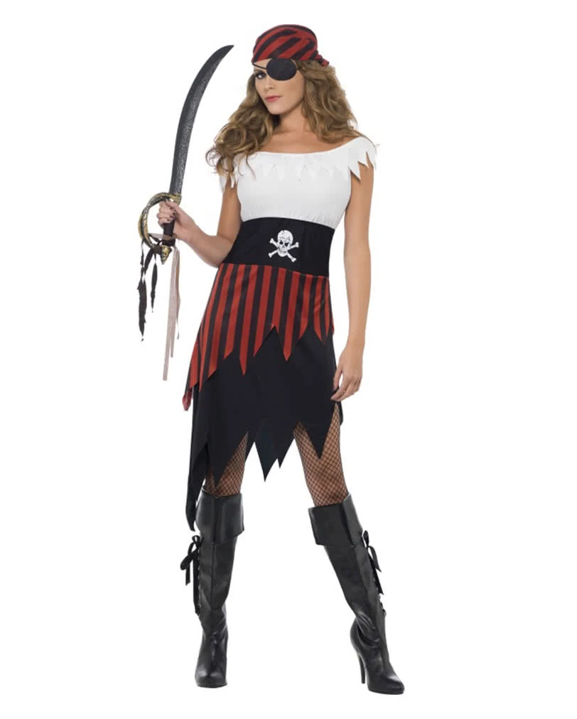 Das Freche Piraten Lady Kostüm besteht aus einem schwarz-weißen Kleid mit einem rot-schwarz gestreiften Rockteil. Auf Bauchhöhe des Kostümes ist ein weißer Totenkopf gedruckt und migeliefert wird ein ebenfalls rot-schwarzes Kopfttuch. Kombiniere zu dem Piratin Kostüm die Piraten Stiefel mit Schnallen und den Piratensäbel mit Schädelgriff und du wirst perfekt gerüstet auf der nächsten Seeräuber Party erscheinen.