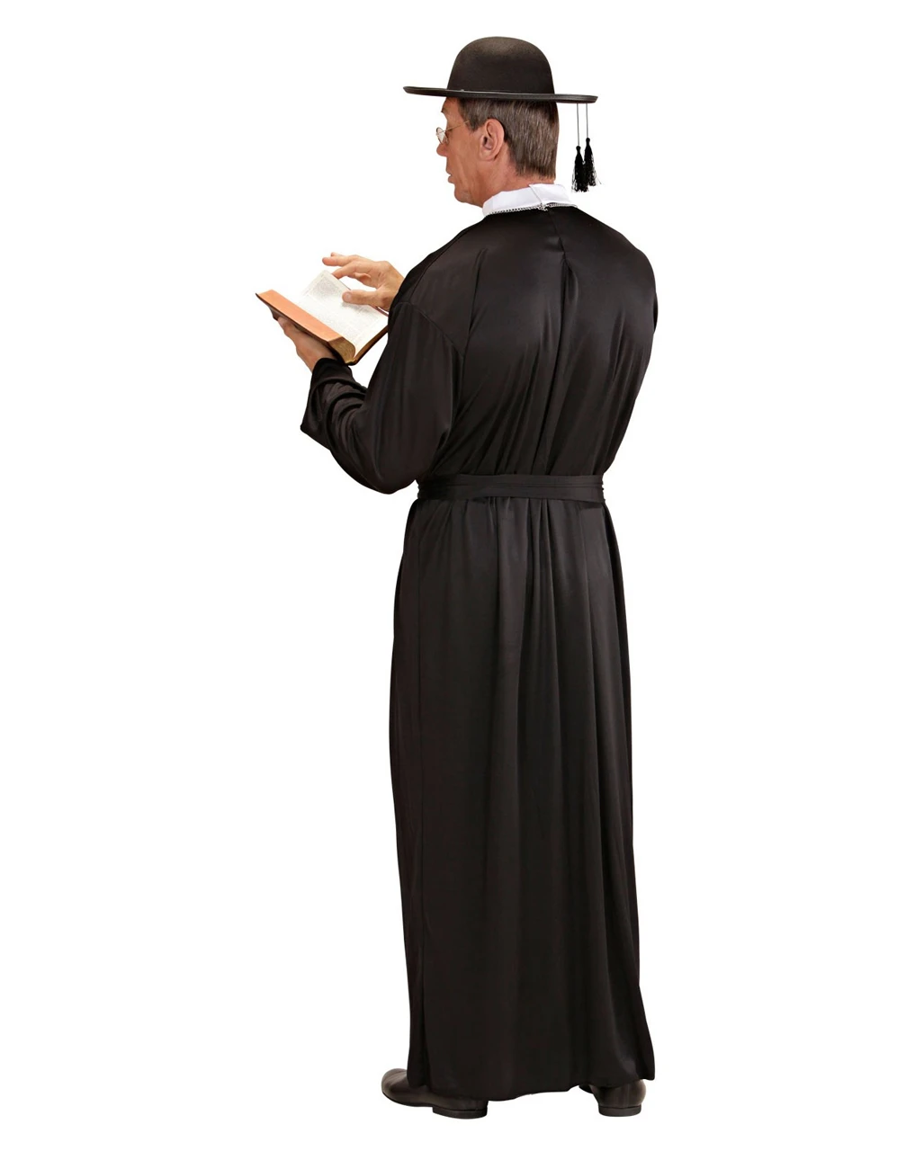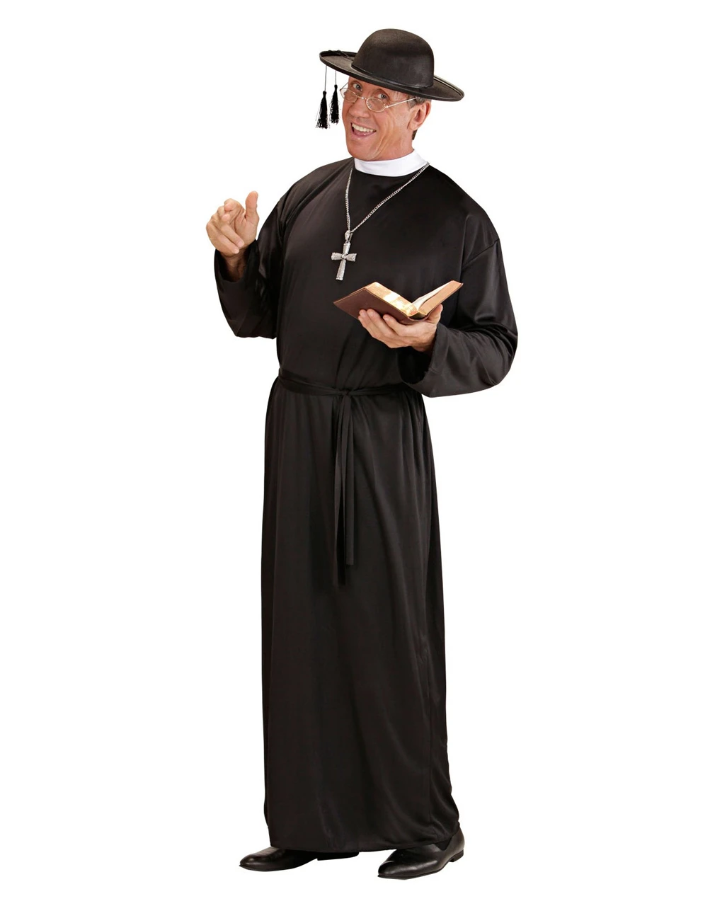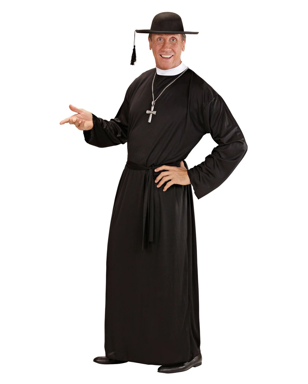 Das schwarze Priestergewand Kostüm ist bodenlang, hat einen weißen Stehkragen und wird mit einem Gürtel um die Taille gebunden. Das zur Pfarrer Verkleidung passende Kostümzubehör wie der Schwarzer Priester Hut & der Rosenkranz mit Kreuz machen dein Auftritt als Priester an Fasching komplett.