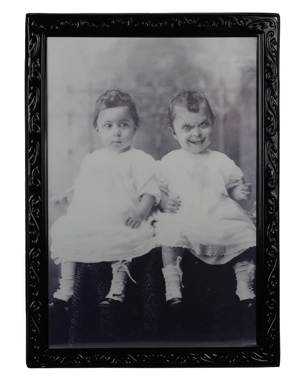 Das Zombie Zwillinge Effektbild besticht durch seine geniale Optik. Im Stil einer alten, schwarz-weißen Fotografie gehalten, zeigt die Halloween-Deko zwei scheinbar süße Zwillinge; je nach Position des Betrachters wandelt sich das Bild jedoch und präsentiert zwei fies grinsende Zombie-Fratzen. Verschnörkelte Ornamente am Rahmen der Grusel-Dekoration lassen das Wackelbild zusätzlich besonders realistisch wirken. Weitere Halloween-Dekoartikel wie das Effektbild Zombie Großvater und den Halloween-Dekoration R.I.P. Grabsteinkreuz haben wir ebenfalls im Karneval-Universe.de!